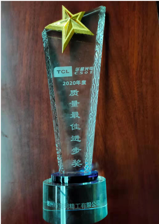 2021年3月10日在华星光电2020年优秀供应商表彰活动中,九游会(中国)荣获 “质量最佳进步奖”。并获颁奖杯。